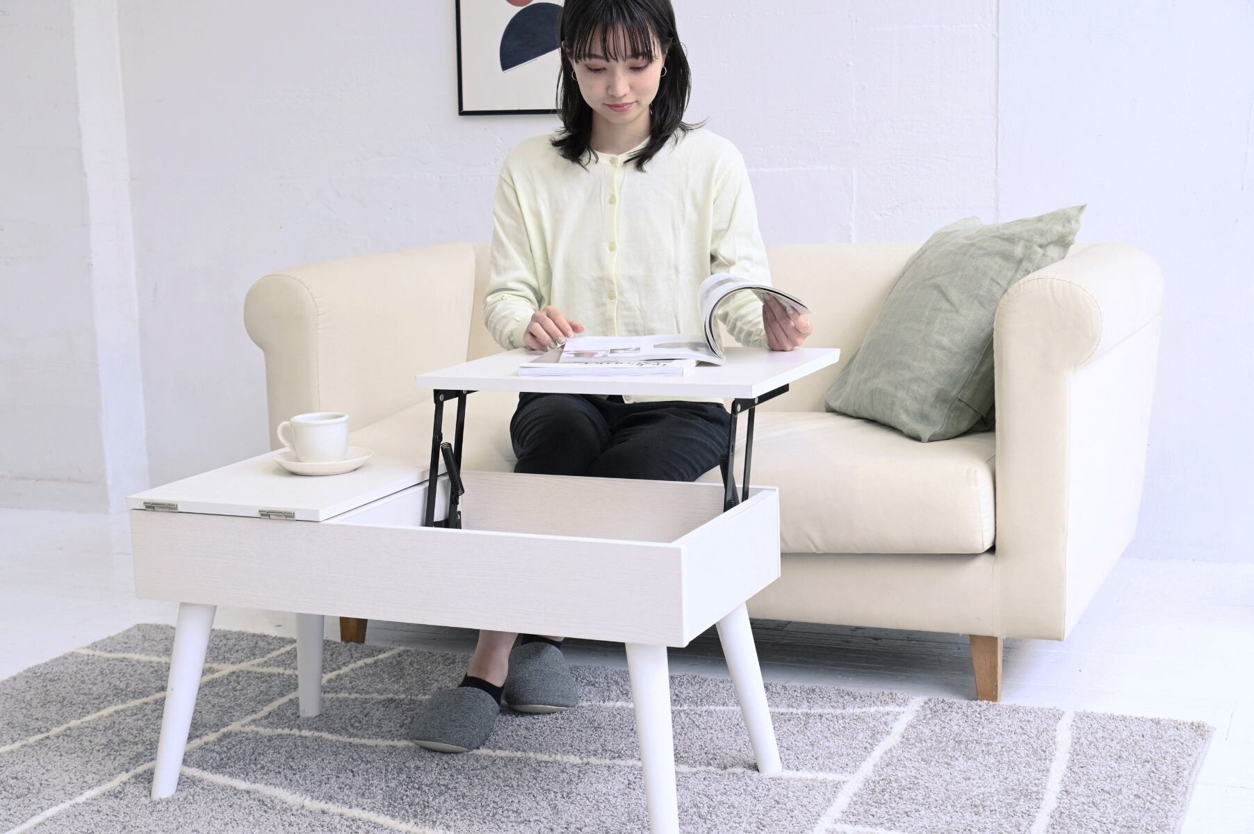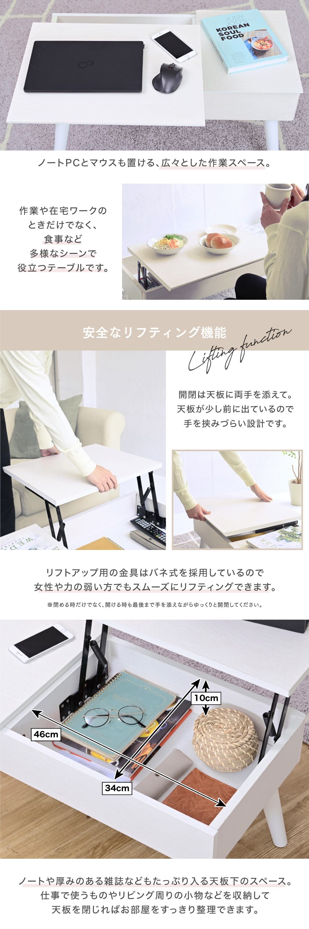 リフティングテーブル ドレッサーデスク 昇降式テーブル 幅80 白 ドレッサー 収納 組み立て簡単 センターテーブル ロータイプ リフトアップテーブル cambio