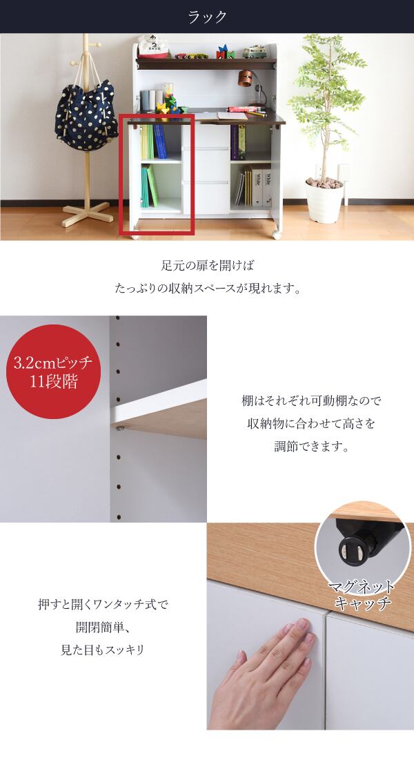 折り畳み式天板は使いたいときだけ広げて使わない時は畳んですっきり、ライティングデスク。薄型で省スペースなのでリビングに最適。お子様の「リビング学習」から、ママやパパのパソコンデスクとしても。上部にはランドセルなどを置けるオープン収納部、下部には扉収納部と3段の引出しで、収納力にも自信あり。コンセント、配線コード穴もあるので、PC、周辺機器の設置もOKです。