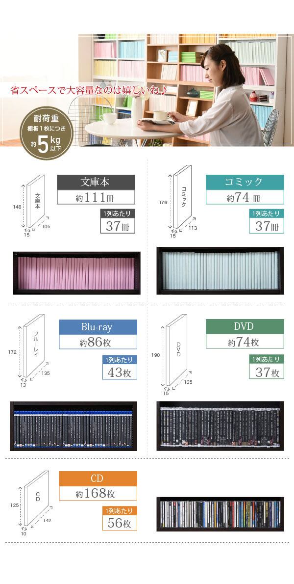 1cm間隔の棚板で、文庫本やコミック、DVD、CDなど幅広いメディアを収納可能。