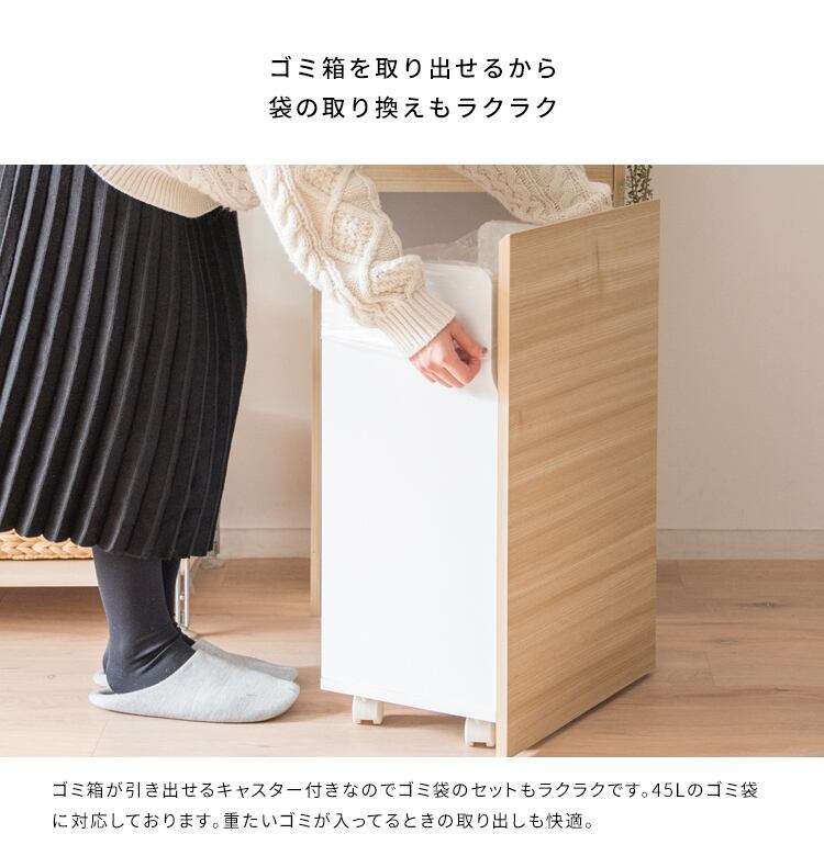 ゴミ袋の着脱も簡単で利便性バツグンです。たっぷり入る容量45Lで大家族のご家庭でも快適。