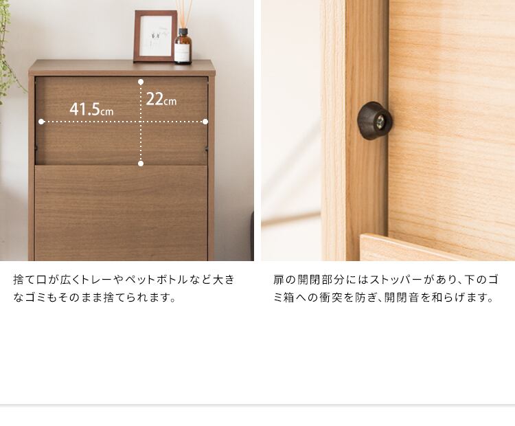 扉の開閉部部にはストッパーがあり、したのゴミ箱への衝突を防ぎ、開閉を和らげます。