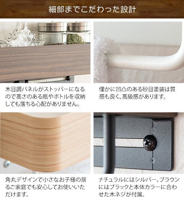 木目調パネルがストッパーになるので高さのあるびんやボトルを収納しても落ちる心配がありません。