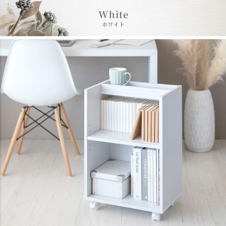 お好みの高さに調整できる二段の棚は文庫本やCD、A4ファイルなど色々な高さの物が収納できます。スリムな天板は囲いがありマグカップの落下を防げます。キャスター付きで移動もラクラク。