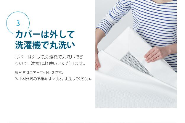 カバーは外して洗濯機で丸洗いできるので、清潔にお使いいただけます。