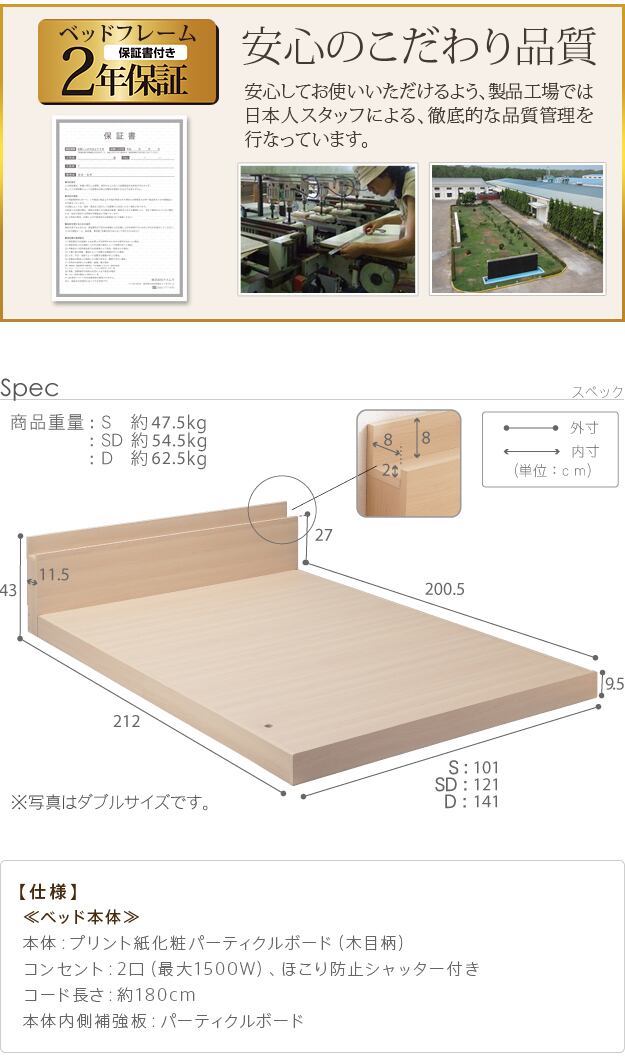 フレームのみ+ヘッドボード付き+コンセント2口付 S(シングル)+S(シングル)