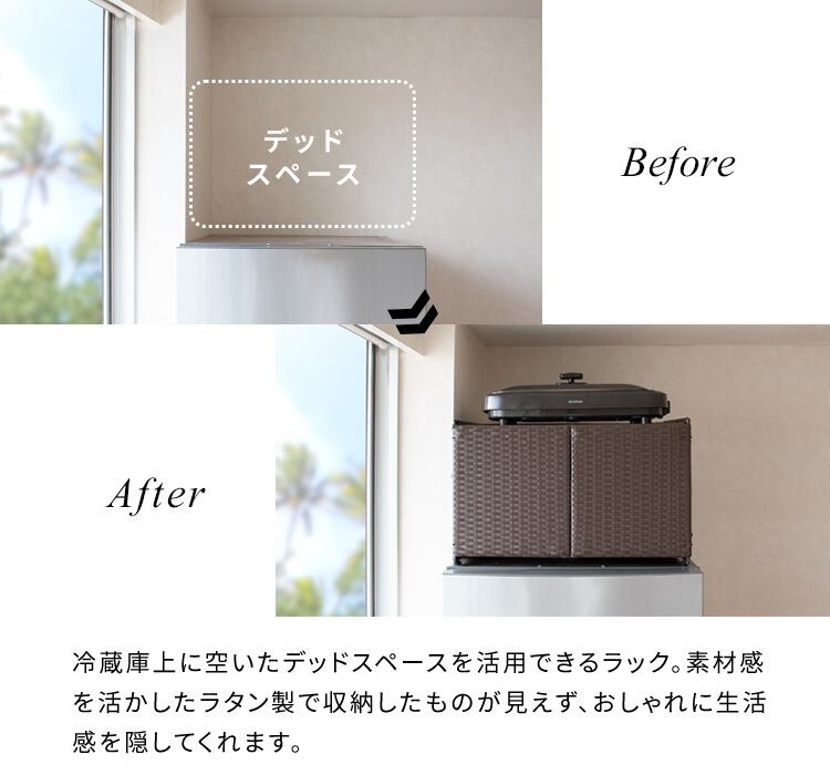冷蔵庫上に空いたデッドスペースを活用できるラック。 素材感を活かしたラタン製で収納したものが見えず、おしゃれに生活感を隠してくれます。