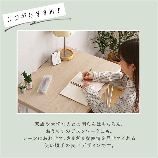 しっかりとした厚み4cmのある天板は高級感のあるホワイトオーク柄を側面、裏面にも施し食卓を上品に演出します。