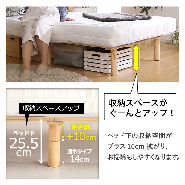 もとの脚に専用継脚を取り付ければプラス10cm拡がり、ベッド下の収納スペースがグーンとアップして通気性もよくなります。