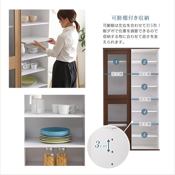 右側に計8段の食器収納棚を設けガラスのスライドドアで