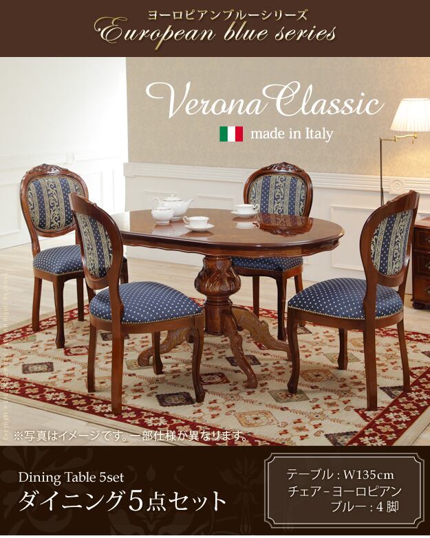 『お得なダイニング5点セット』ヴェローナクラシック 5点セット:テーブル幅135cm+チェア-ヨーロピアンブルー4脚