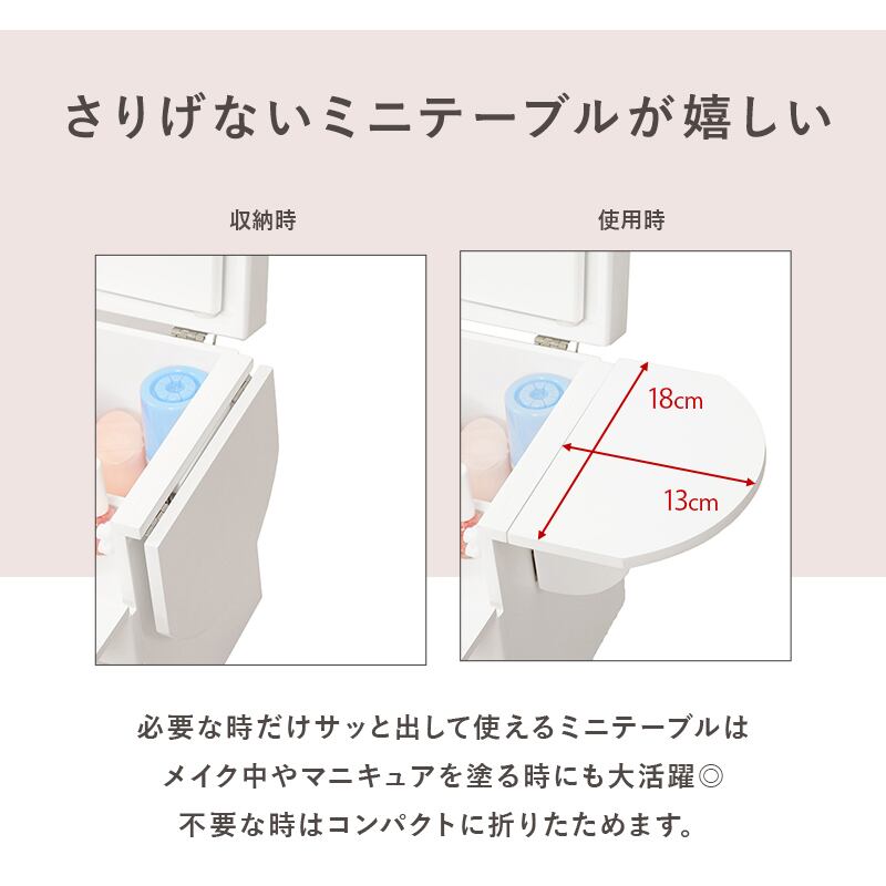 三面鏡がついた大容量のコスメボックス。サイドにバタフライ式のミニテーブルも付いています