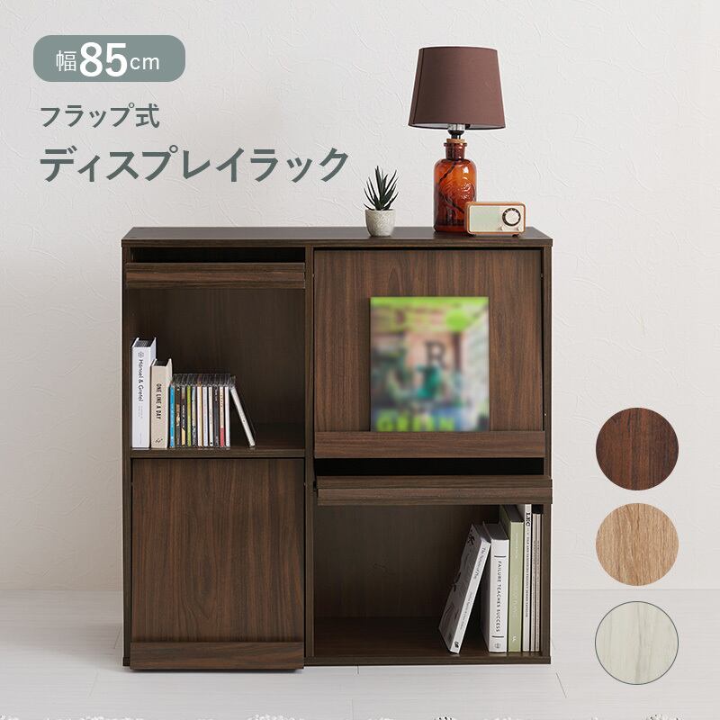 フラップ式ディスプレイラック 中の収納を隠しながら扉にお気に入りの雑誌などを飾れるラック。A4ファイルも収納可能なサイズです。