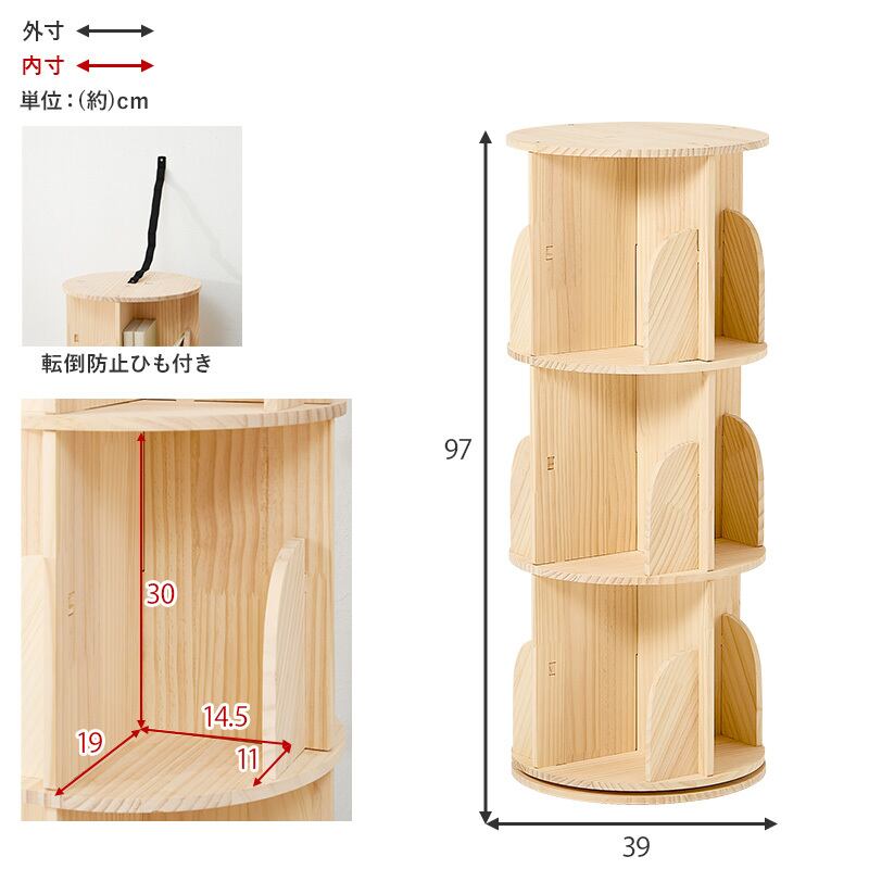 丸回転ラック 360度回転するので本が探しやすく、省スペースなのに大容量な本棚。天然木パイン材を使用しており、無塗装なので経年変化を楽しんだりDIYでアレンジしたりできます。